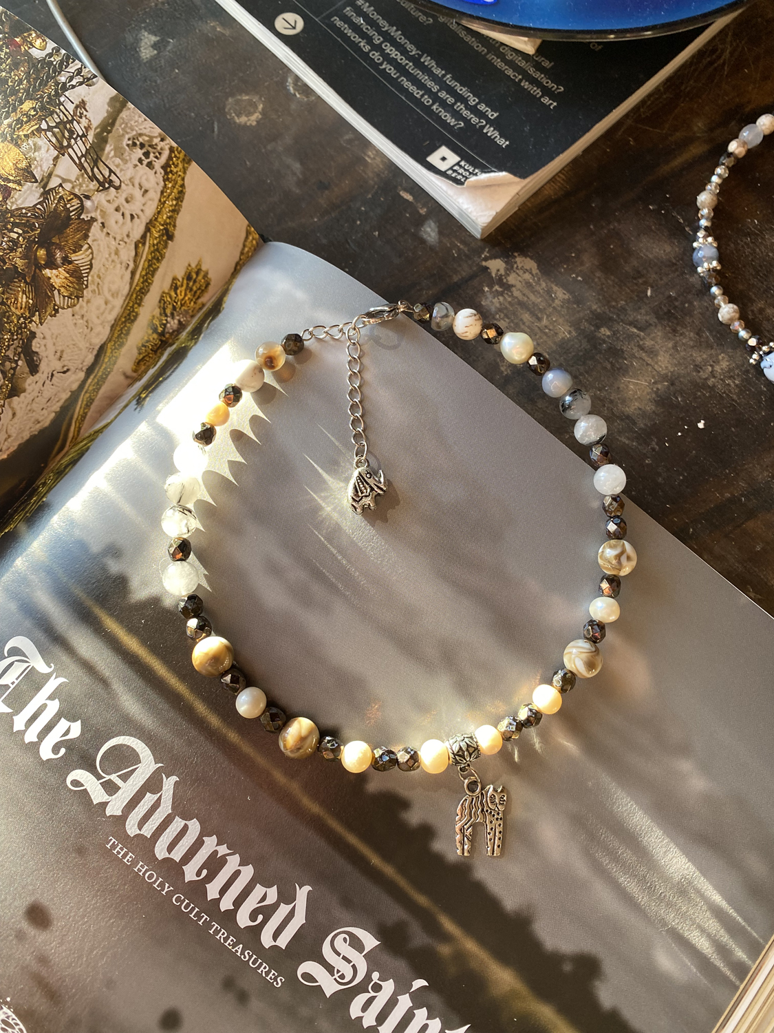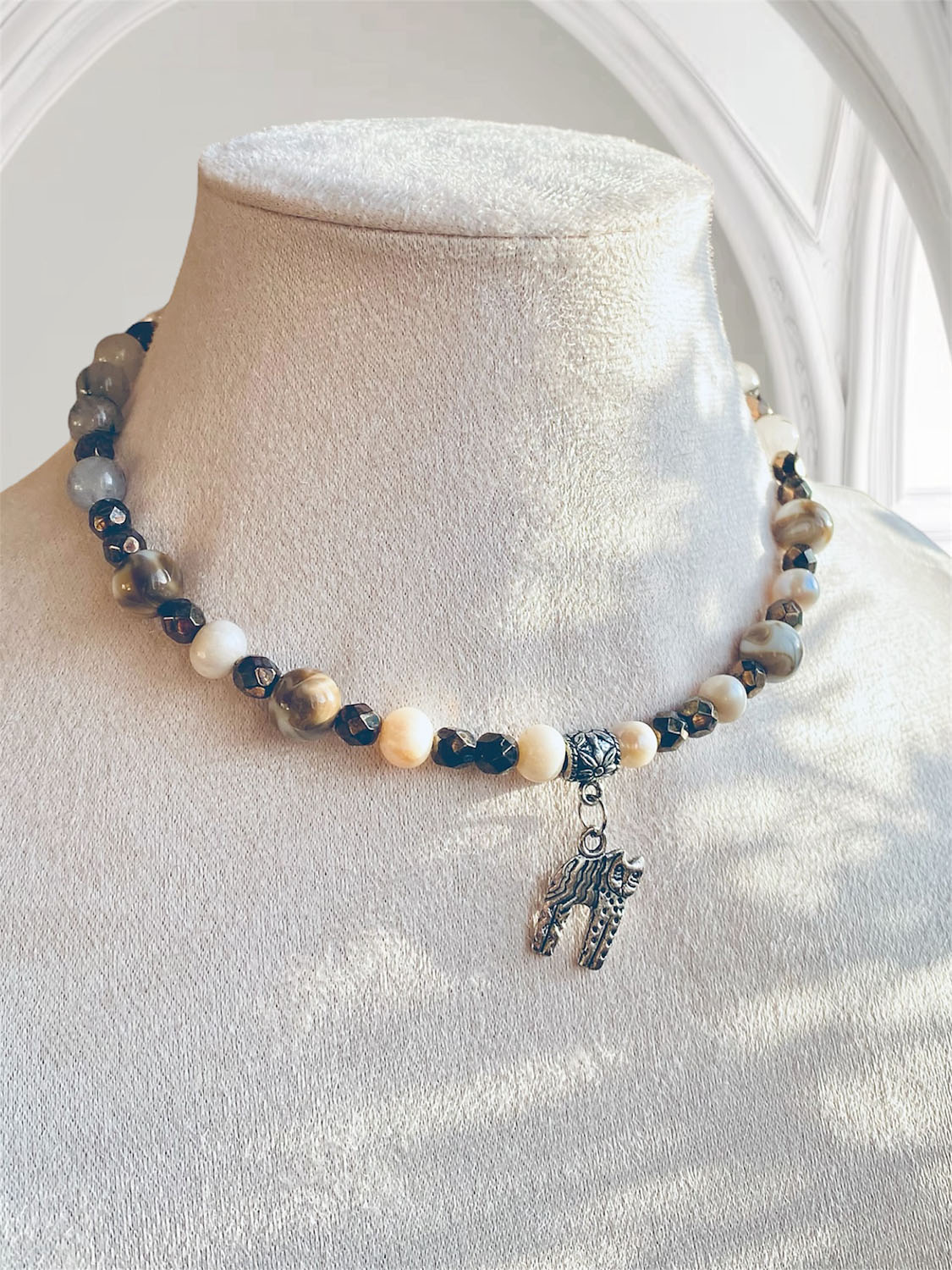 Druhý náhrdelník s kočkou je fešácký obojek s říčníma perlama smetanového zabarvení, nalezených korálků z druhé ruky i mých oblíbených ohňovek od českých sklářů. Navlečeno na paměťový drátek. Přítomny jsou také acháty, ségra kočka a vzadu na zapínání sloník pro štěstí.