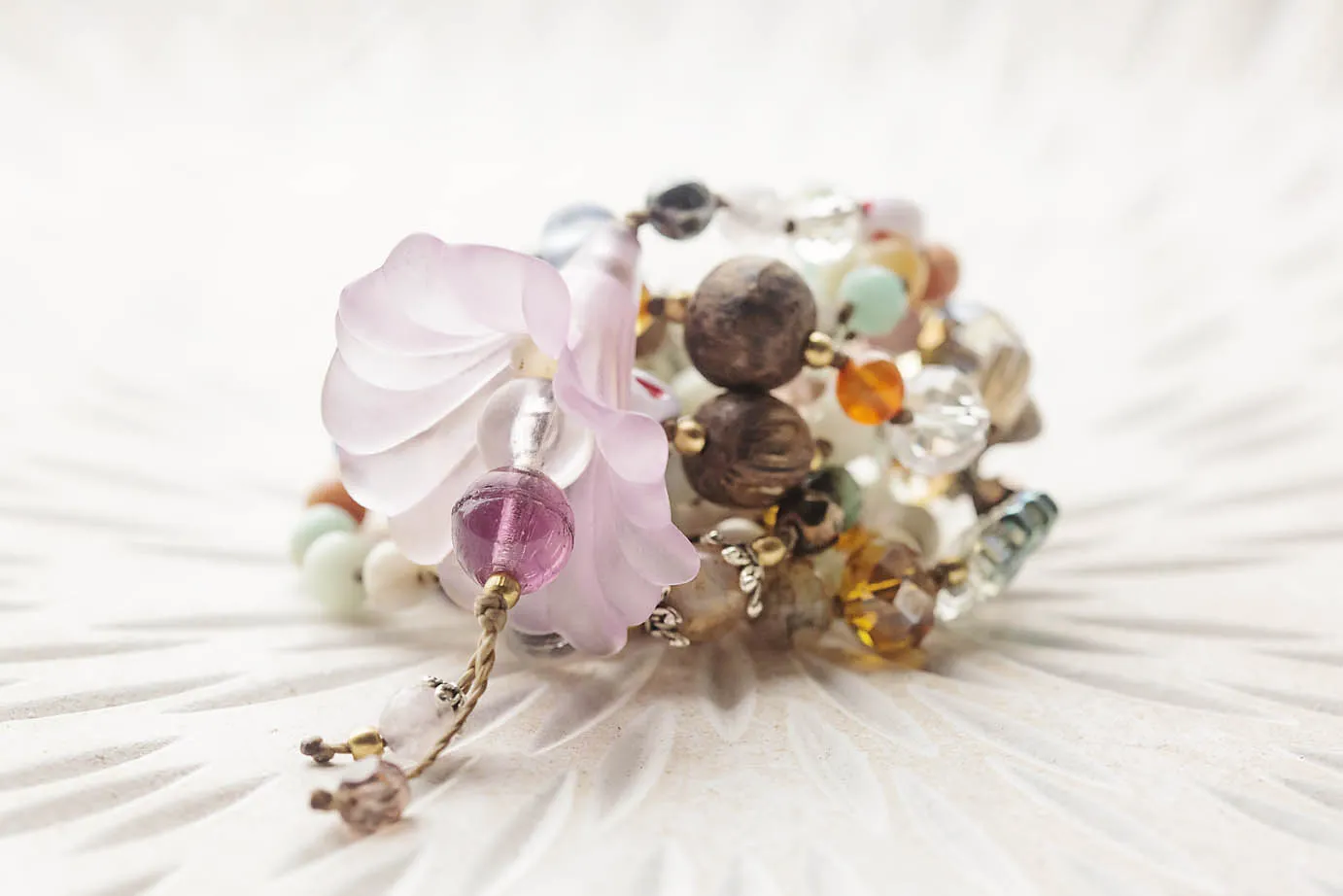 Představuji vám tu třetí harajuku málu laděnou do duhova, požehnanou Lakshmí mantrou, hinduistickou bohyní prosperity a lásky. Kromě vintage korálků všemožného druhu na ní najdete i v nemalé míře zastoupené drahokamy, hlavně amazonit o průměru 6mm.