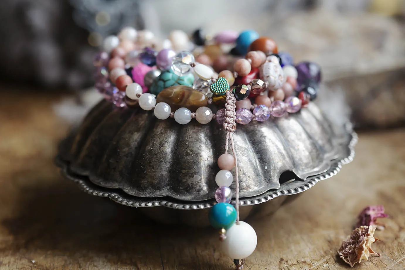 Tohle je Harajuku mála 108 #4. Tvořit harajuku mály mne napadlo v létě 2025, když jsem přijela domu integrovat silné dojmy z Healing festivalu. Tu noc jsem měla sen, ve kterém navlékám na niť sbírku krásných korálků, hrály duhovými barvami a jejich rozličné tvary se třpytily na slunci jako vesmírné drahokamy. Korálky a vše blýskavé sbírám už snad od narození, možná proto, že mi připomínají svět, odkud jsem přišla. Duha, třpyt a blýskavé odlesky...něco na tom je, co možná nejenom mě připomíná pradávné "doma". Když jsem se probudila, věděla jsem, že chci navlékat mály z těchto korálků, hravé a barevné jako svět japonského pouličního stylu harajuku. Styl, ve kterém můžete po Tokyu chodit jako krajková panenka, jsem kdysi objevila v knihovně Langhans v jedné z mnoha těch úžasných fotografických knih, které knihovna Langhans nabízela k prohlédnutí.