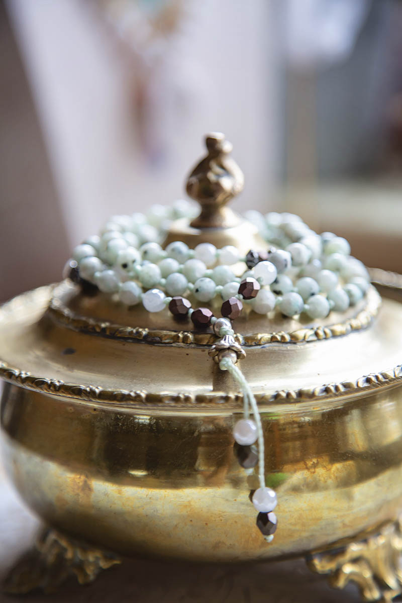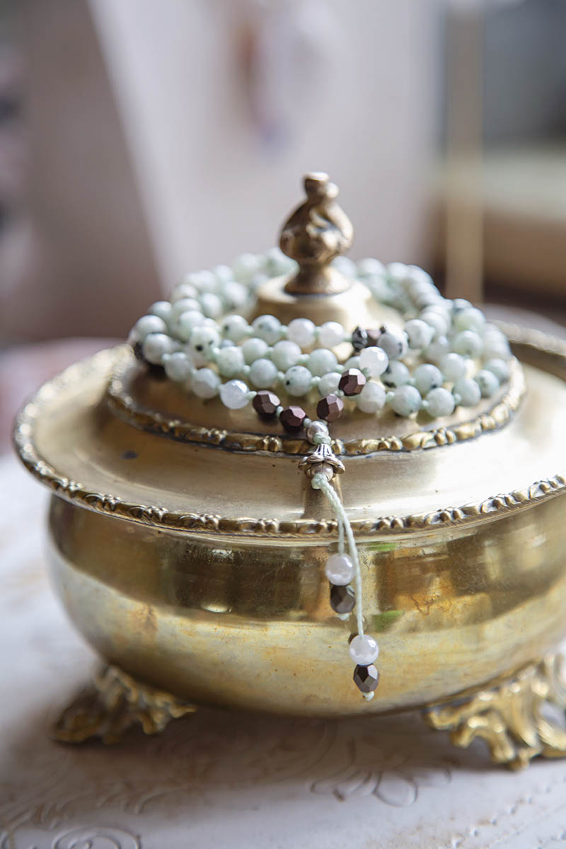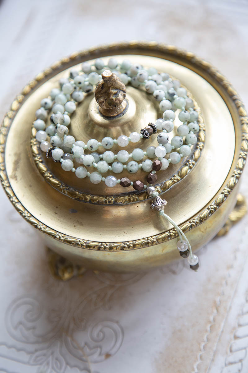 Jemnost téhly mály tvoří nazelenalé světlé korálky matovaného jadeitu doplěné českými ohňovkami.