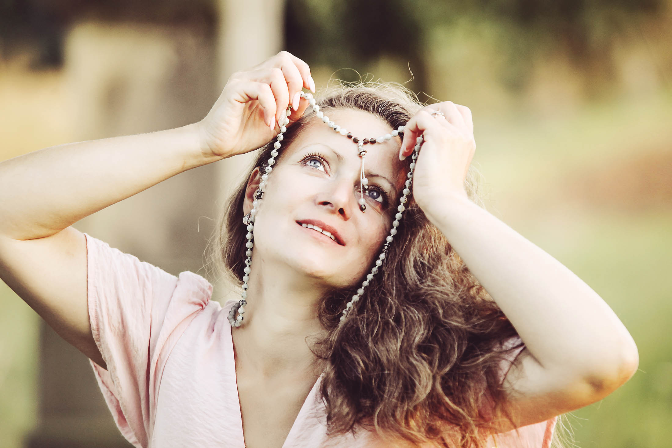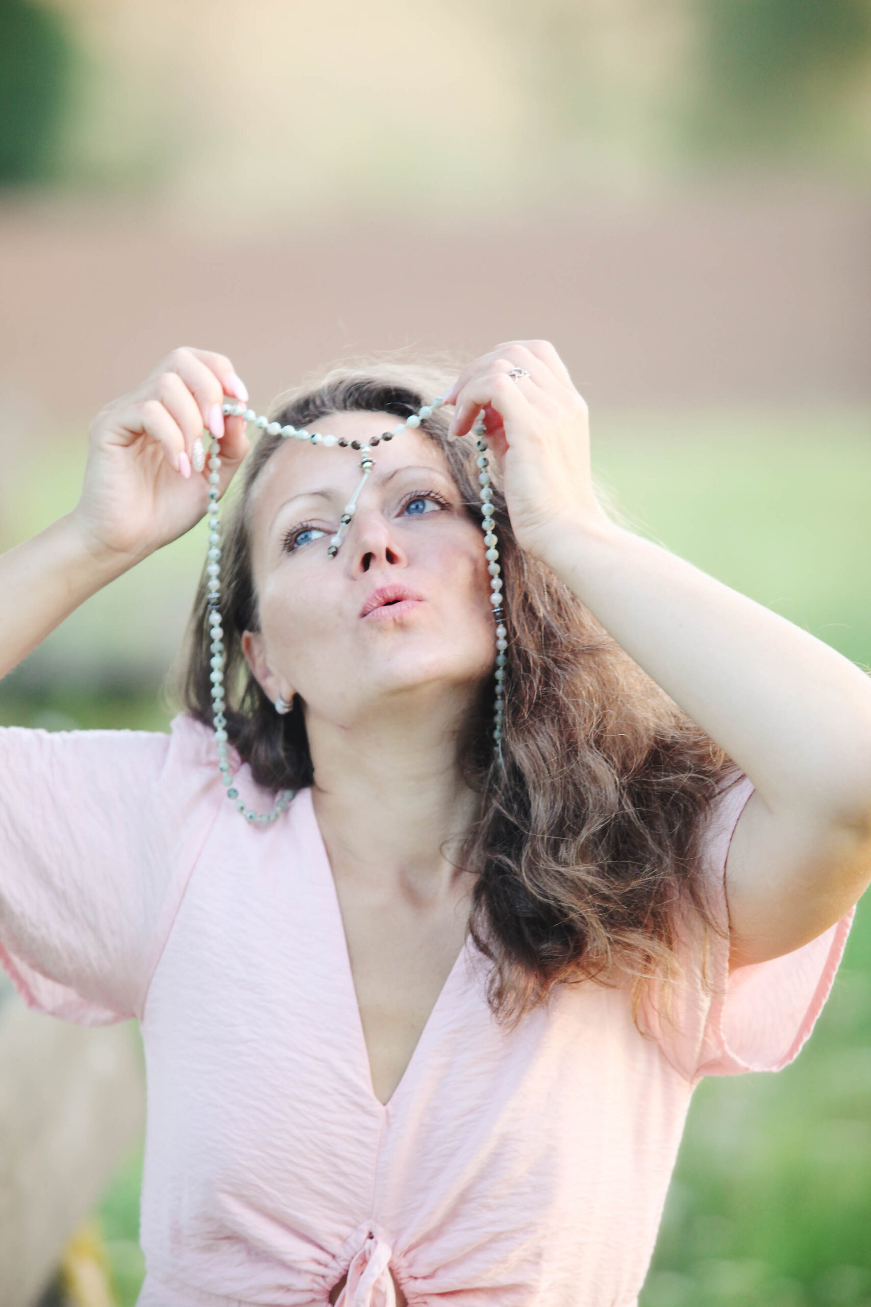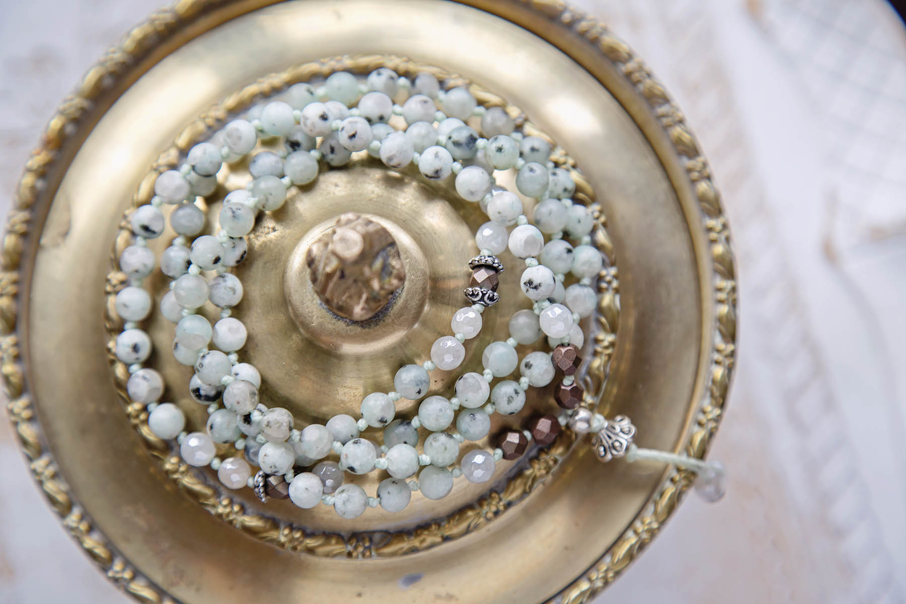 Jemnost téhly mály tvoří nazelenalé světlé korálky matovaného jadeitu doplěné českými ohňovkami.