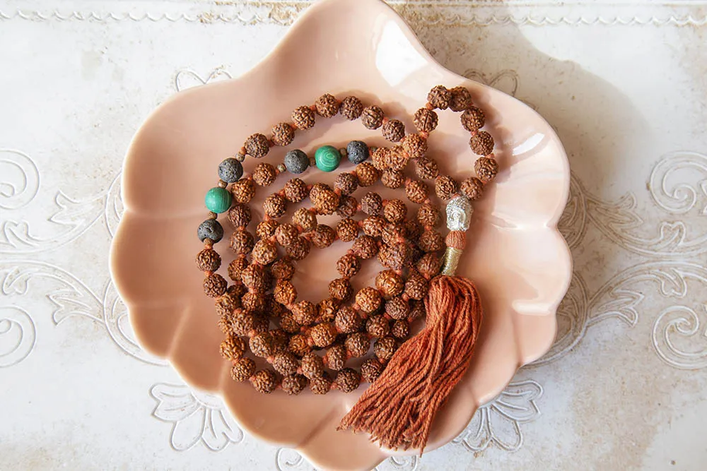 Tato mála 108 s hnědým střapcem je vytvořena ze světle hnědých semínek rudrakshy, lávových korálků a malachitu. Nad střapcem je korálek Budha.