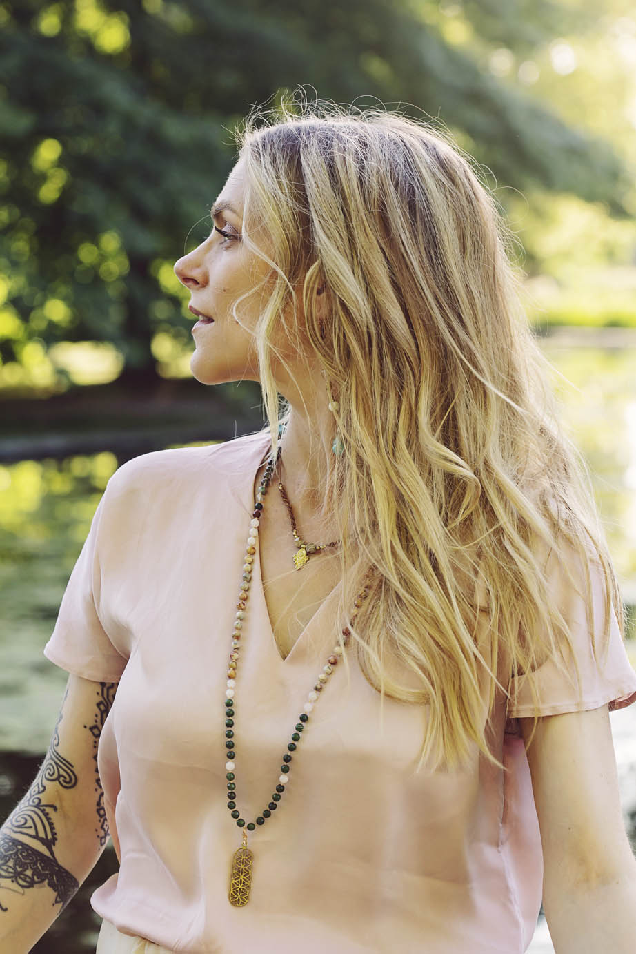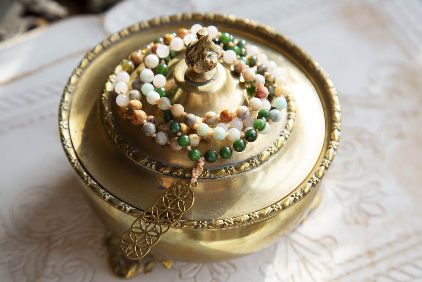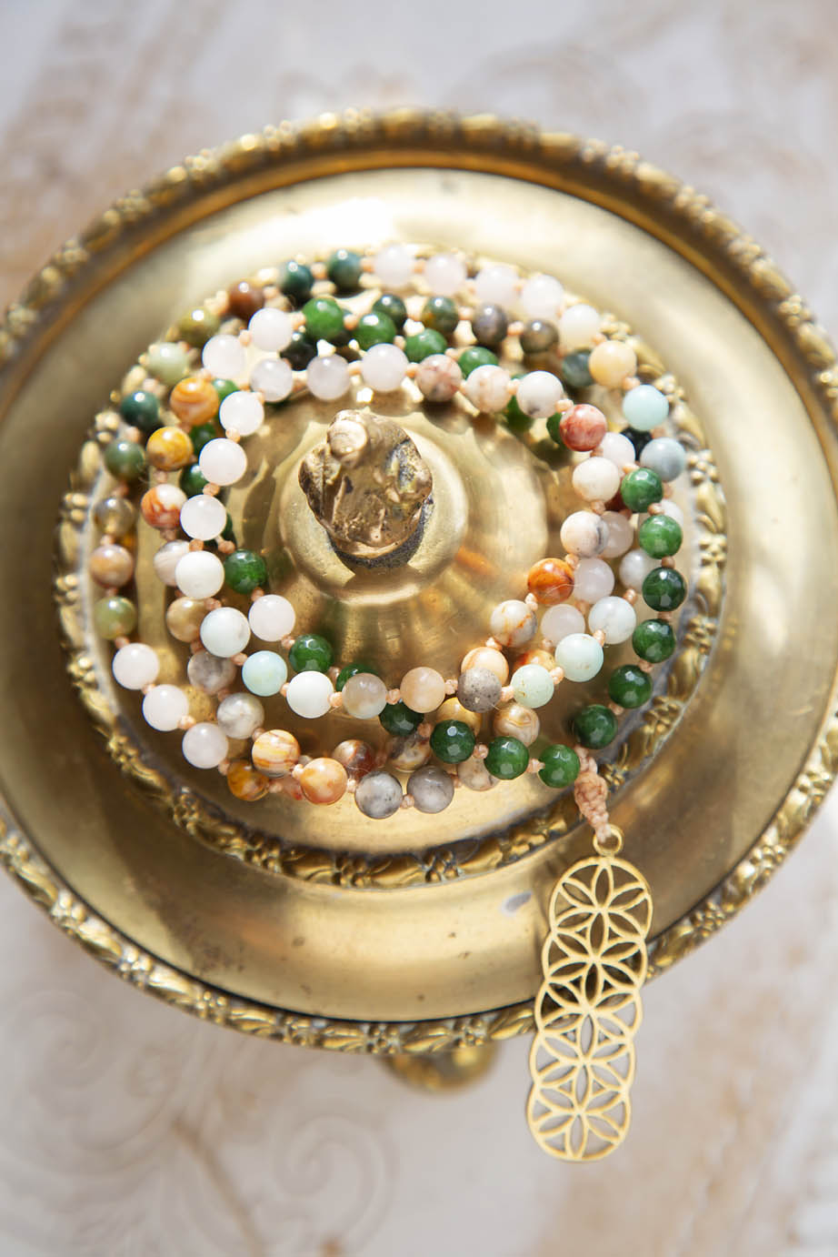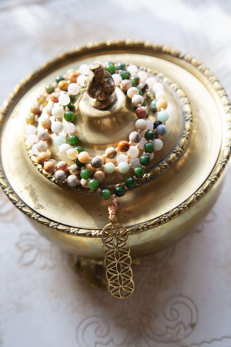 Mála 108 s květem života, laděná do béžovozelena, prodloužený vzor květu života z mosazi doplňuje náhrdelník pro zpěvy manter.