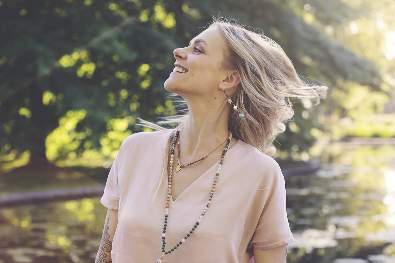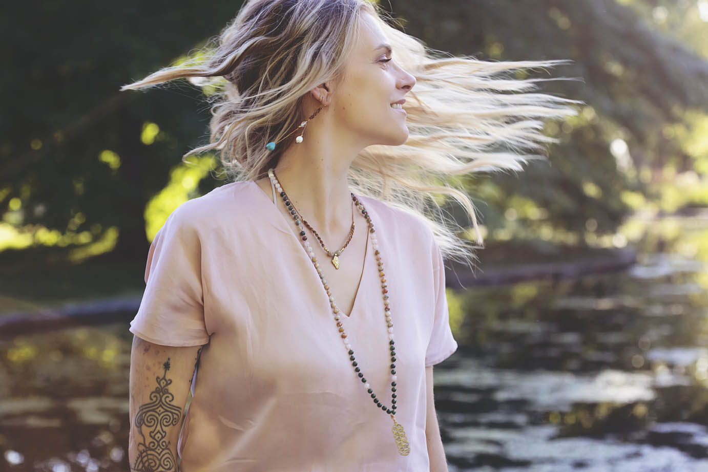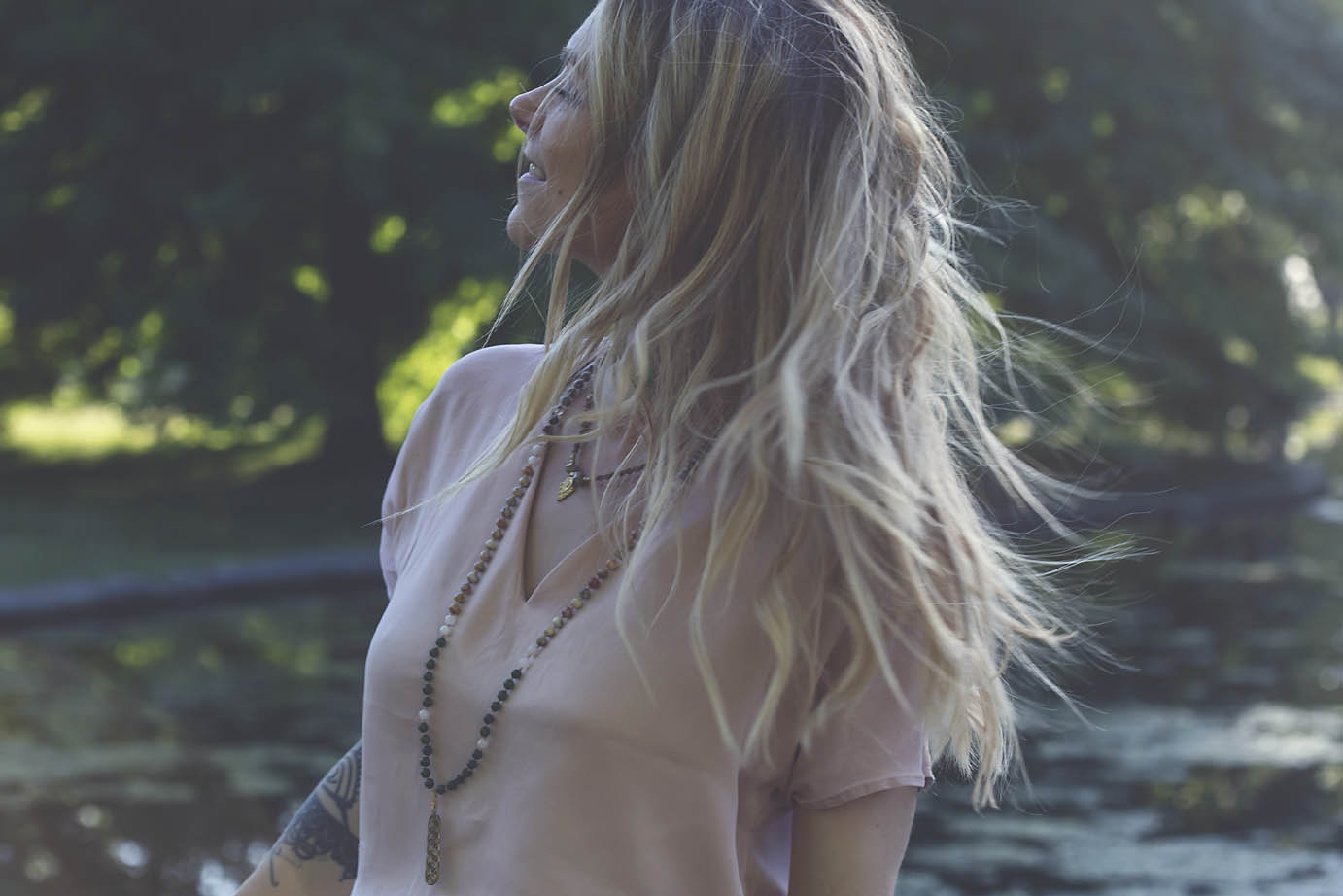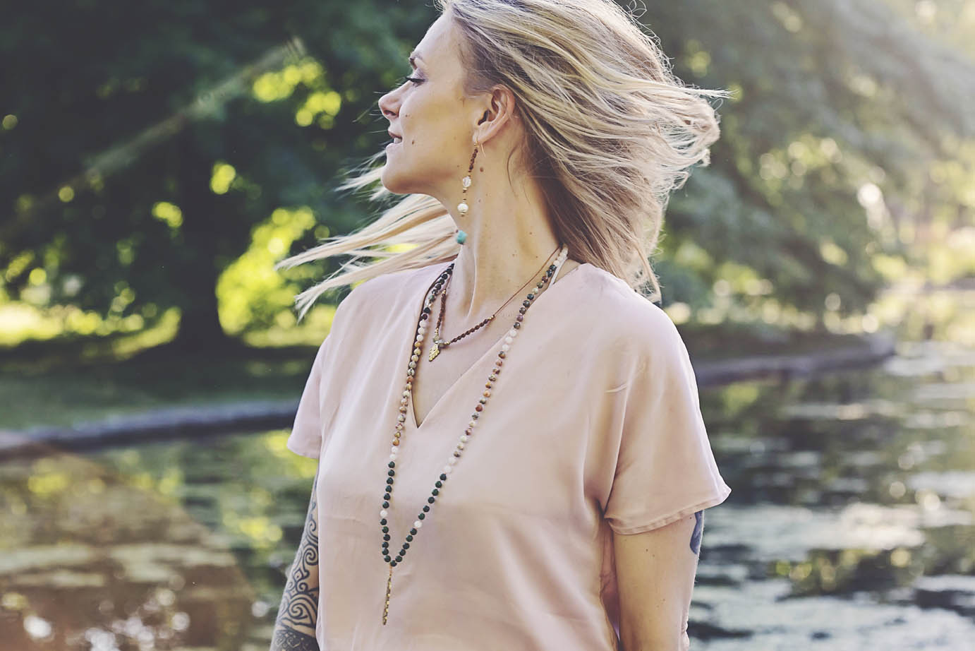 Mála 108 s květem života, laděná do béžovozelena, prodloužený vzor květu života z mosazi doplňuje náhrdelník pro zpěvy manter.