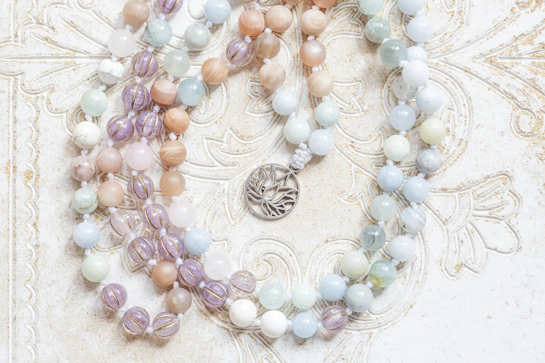 Překrásná mála 108 v pastelových barvách s lotosovým květem z bílého kovu je vytvořena za zpěvu manter z šesti druhů drahokamů a skleněných korálků od českých sklářů.