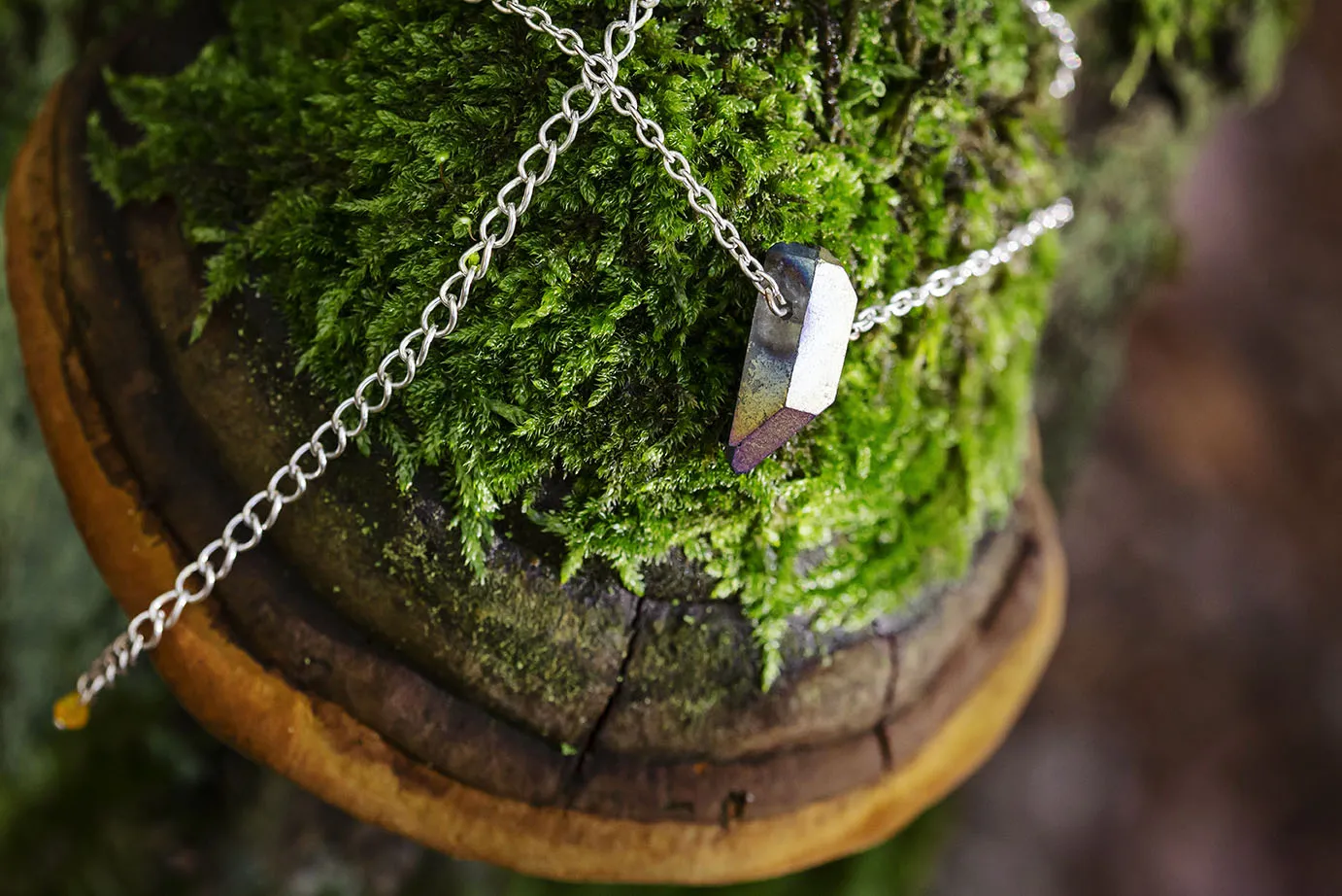 Náhrdelník s krystalem křišťálu s titanovou povrchovou úpravou, která dává kameni temně duhový odstín.
