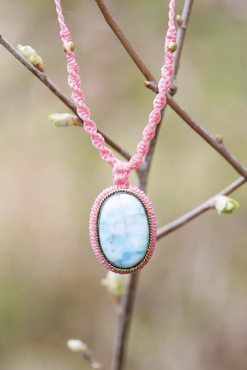 Krásný larimar v mosazném osazení a macramé zpracování vytváří nevšední náhrdelník.