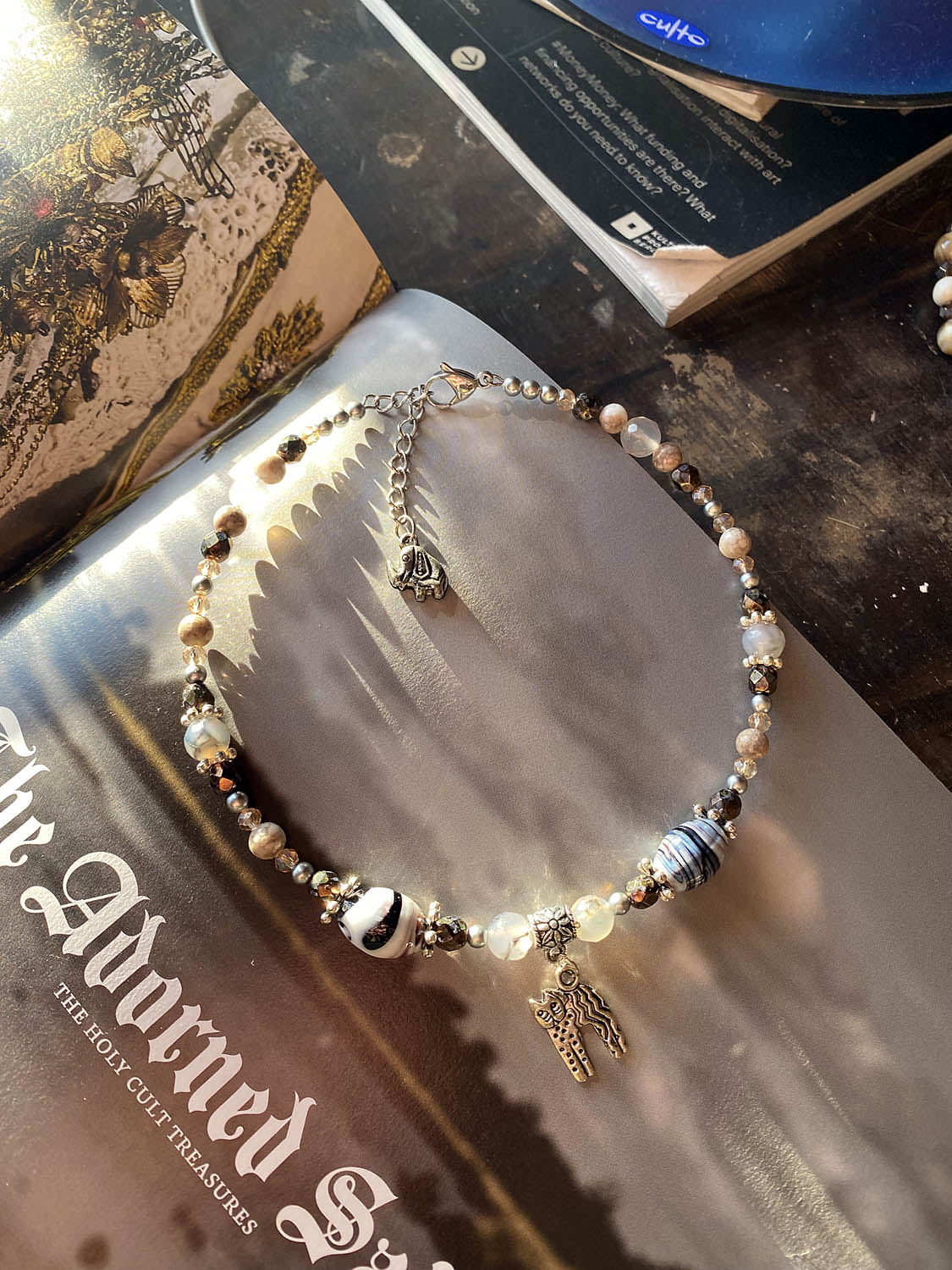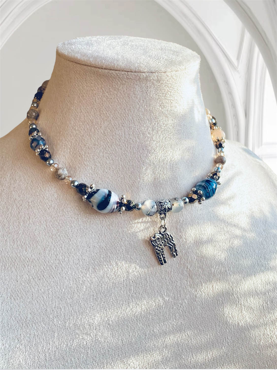Tohle je náhrdelník s kočkou a budou dva hodně si podobný, protože jsem zas rozebrala jedny náušnice. Krásně manýristicky navržený přívěsky koček na afroháčkách. A na ty afroháčky právě, kdo je znáte, jsem nějaká psychicky alergická a tak mne to vždycky inspiruje k ničení a znovuzrodu. Takže kočky šly od sebe a dostaly obojek. Tahle první (druhou naskladním někdy v závěsu) je představena jako první zejména proto, že má takovou společnost korálků - při mé posldní návštěvě Jablonce jsem navštívila klasickou výstavní prodejnu skleněných korálků na náměstí, která od dob totality nezměnila sortiment ani design, zato ceny astronomicky vzrostly. I tak mne ten zážitek inspiroval k tomu koupit si tam alespoň symboiicky malý suvenýr v podobě černobýlých až kouřových korálků. Kromě nich (jsou vepředu) je choker ozdoben ještě pravým kamením a to hlavně achátem a křepelčím kamenem. Další kompomenty tvoří korálky mých oblíbených českých sklářů odjinud a další kovové a vintage drobnosti. Vzadu je řetízek pro adjustaci velikosti a sloník pro štěstí.
