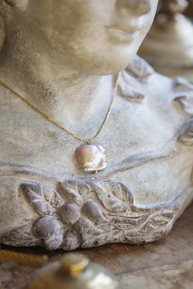 Jednoduchý a přitom efektní náhrdelník s perletí na zlaté macramé šňůrce doplněný o korálky s lotosy.