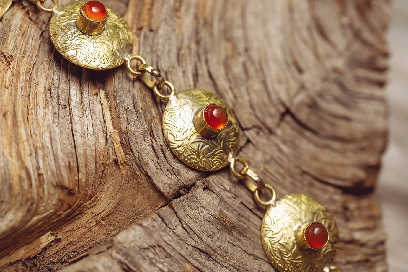 Překrásný mosazný náramek s karneolem připomíná antický šperk.