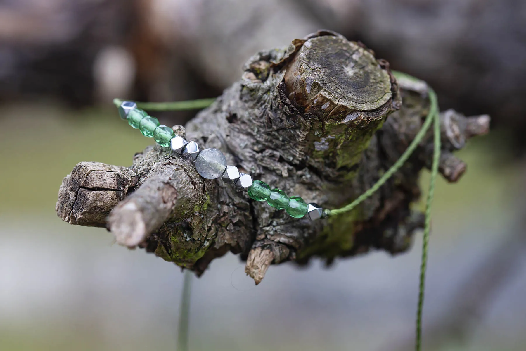 Krásný náramek z macramé šňůrky jarně zelené barvy s labradoritem, fasetovanými hematity a skleněnými korálky.