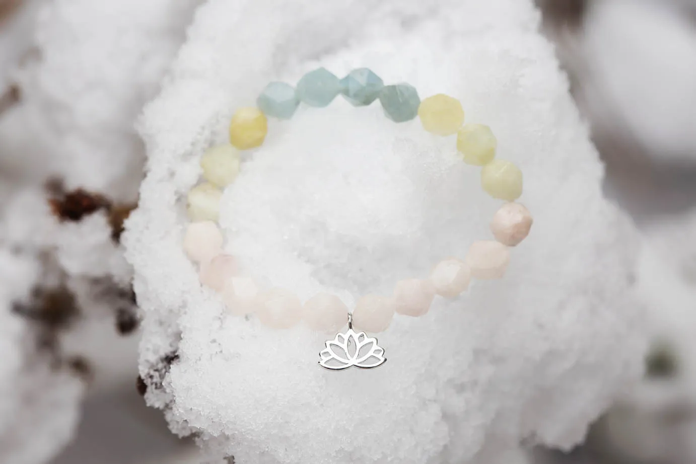 Krásný náramek s fasetovanými kubickými morganity, ve středu je jemný lotos z nerezové ocele.