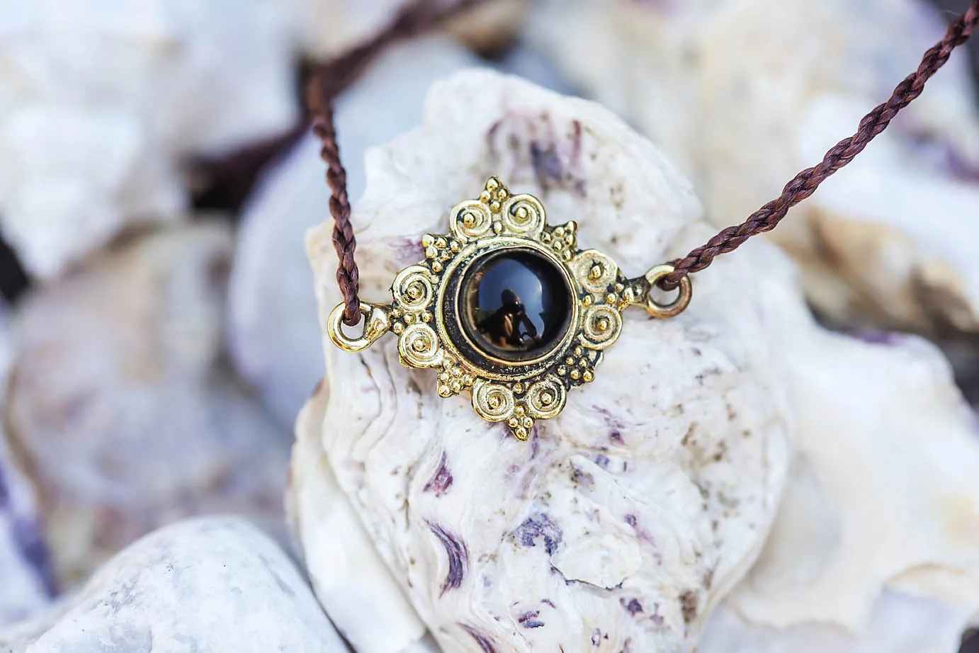 Krásný náramek z hnědé macramé šňůrky ve tvaru dvoušroubovice DNA a s onyxem v mosazném ornamentu.