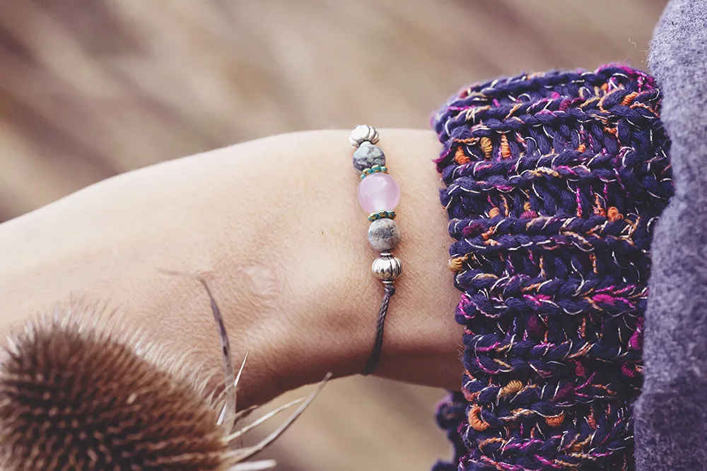 Jemný náramek růženín s africkými tyrkysy a kovovými korálky na khaki macramé šňůrce.