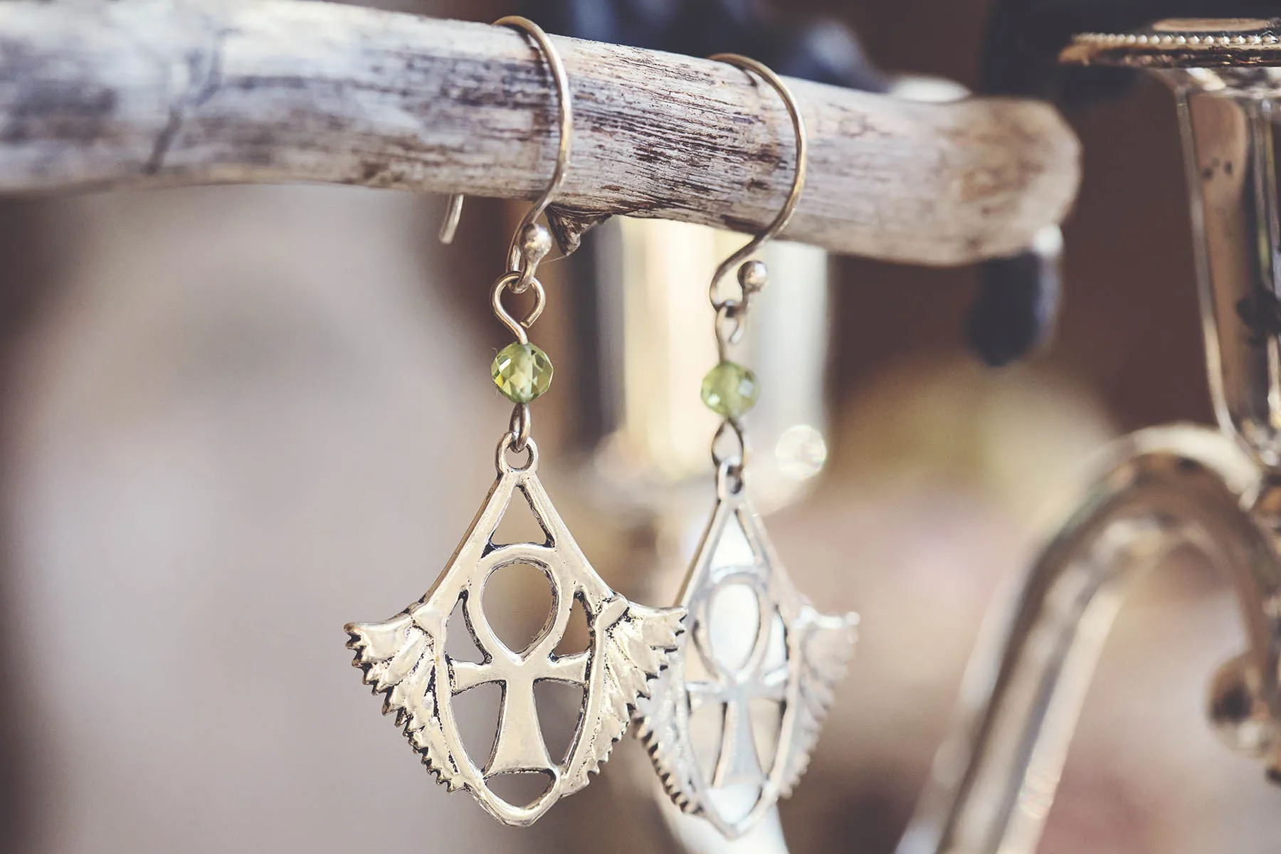 Jedinečné náušnice egyptský kříž Anch s malým fasetovaným olivínem.
