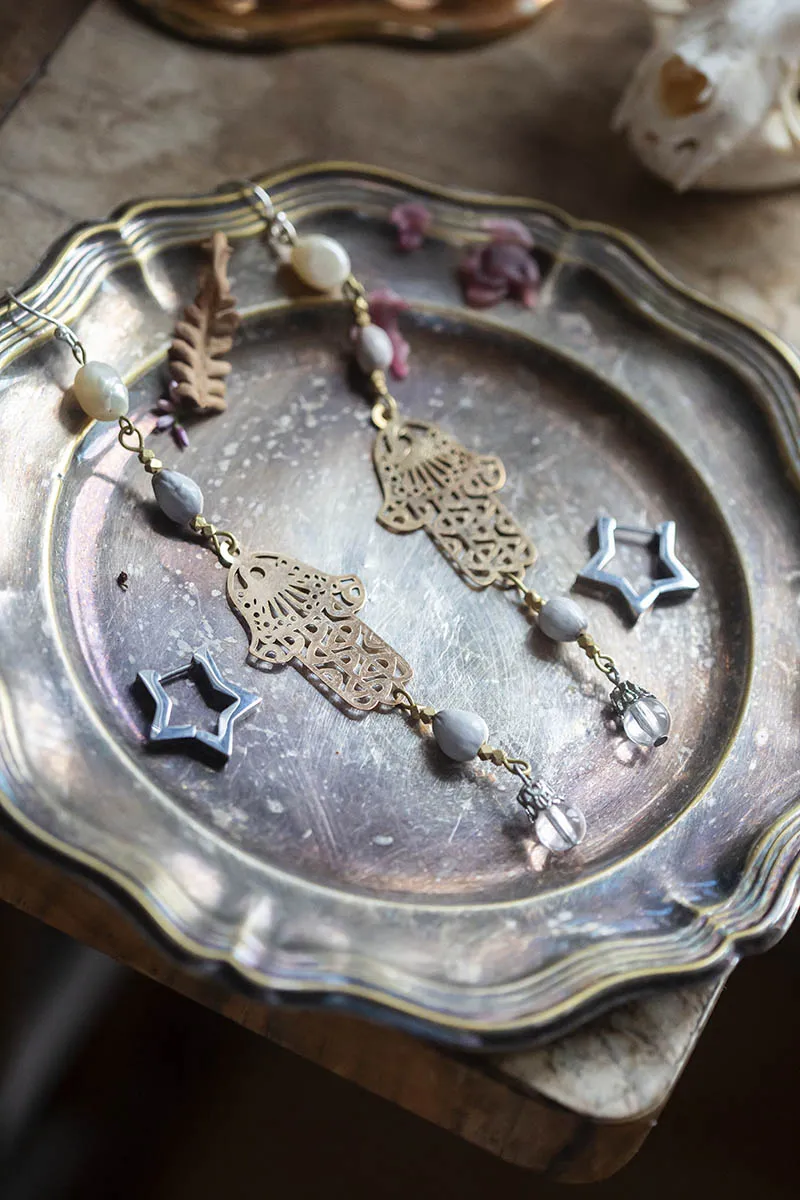 Náušnice Hamsalabim jsou tvořeny tvořeny ve stylu trash art dekorativními hamsami ve zlaté barvě, doplněnými říční perlou a lotosovými semínky. Každá moderní čarodějka ocení lehkost majestátných náušnic, ve kterých protančí noc, aniž by ji zabolely její velice delikátní sametová ouška.