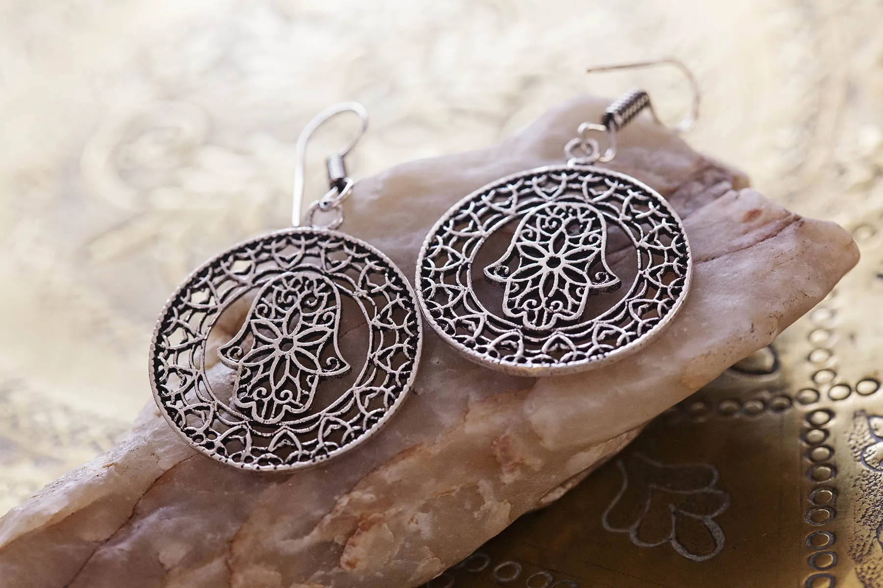 Krásné jemné mandaly s hamsou z bílého kovu.