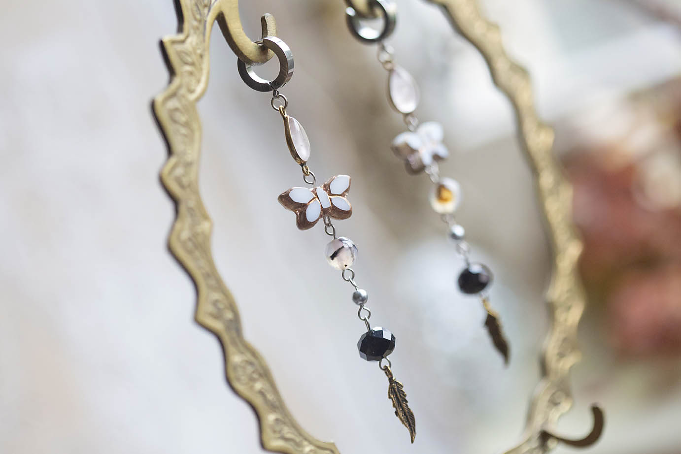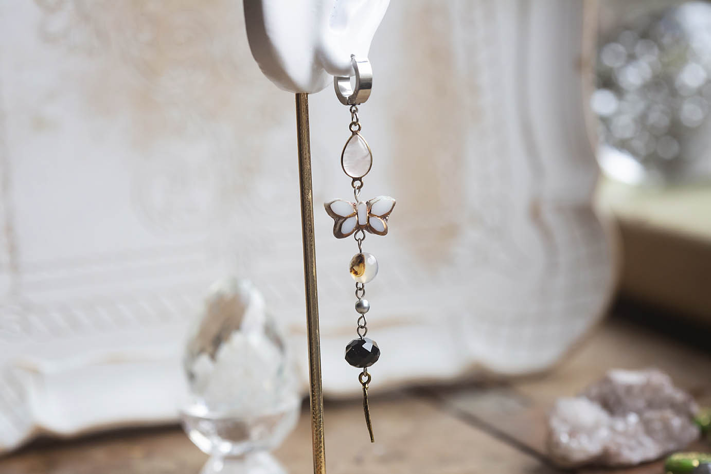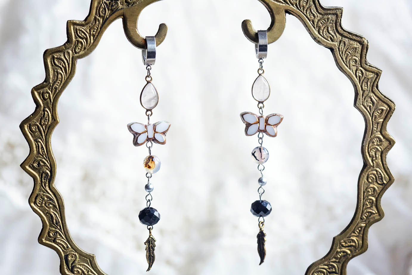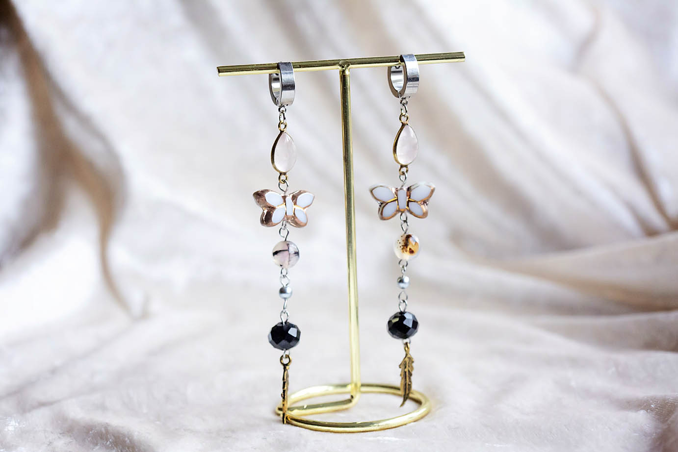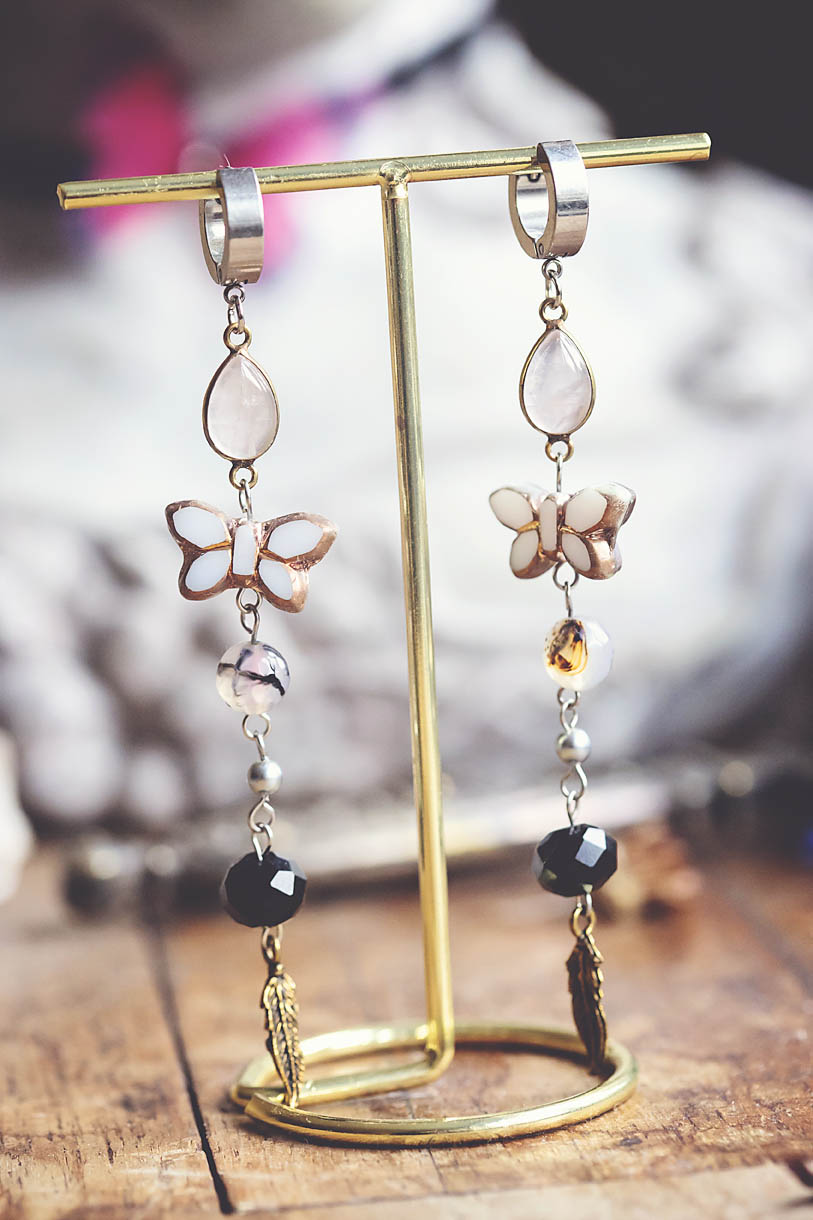 Mám tu kolekci hotovou už dlouho, tvoření, to jde samo, jen to naskladňování mi vždycky trvá věčnost. Tak tady jsou - Náušnice motýlí ezopunk #2. Vévodí jim opět milovaní motýli od českých sklářů, tentokrát ve společnosti růženínů z indie, dračích achátů a mosazných pírek, ty jsou rovněž z Indie. Háčky jsou z nerez oceli. Pro všechny punkové víly co jich znám, i pro ty, co neznám ♥.