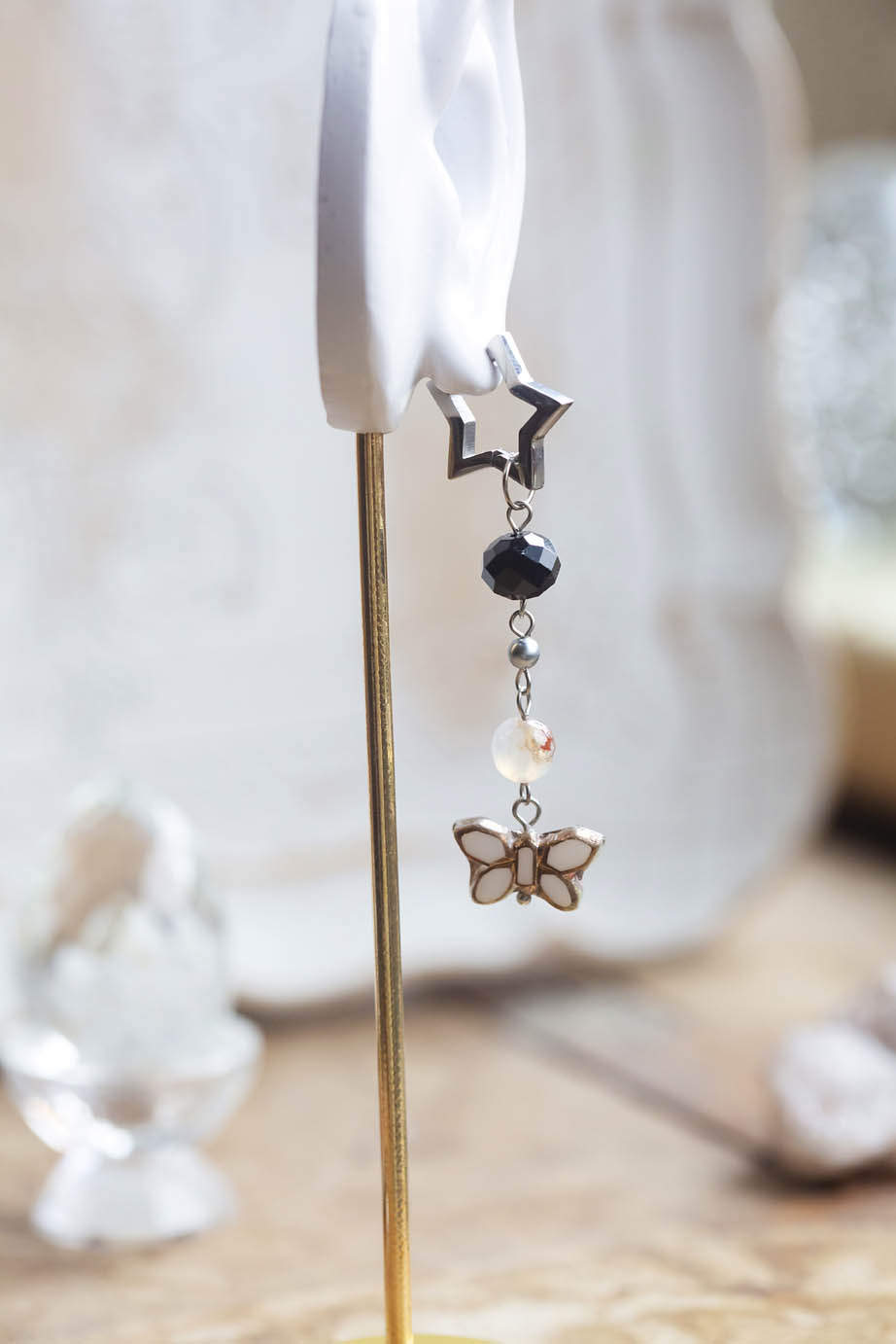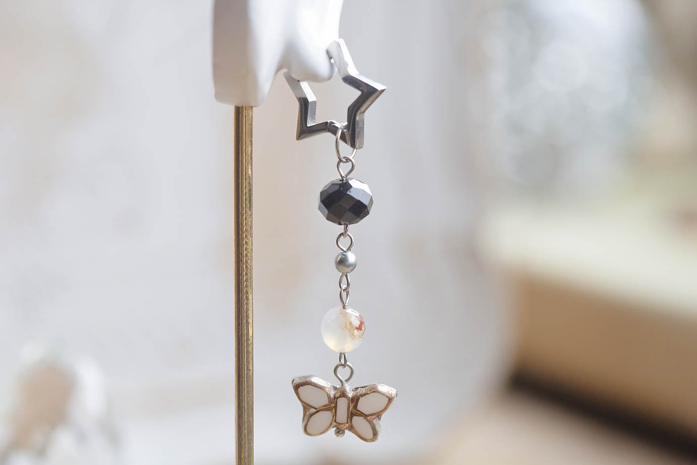 Náušnice motýlí ezopunk #5, jedny z posledních z této motýlí kolekce jsou složeny z našich oblíbených skleněných motýlků od českých sklářů, mosazných pírek z Indie, fazetovaných dračích achátů a černého skleněného korálku z rozebraného náhrdelníku. Háček je tvořen masivní pěticípou hvězdičkou z nerezové oceli.