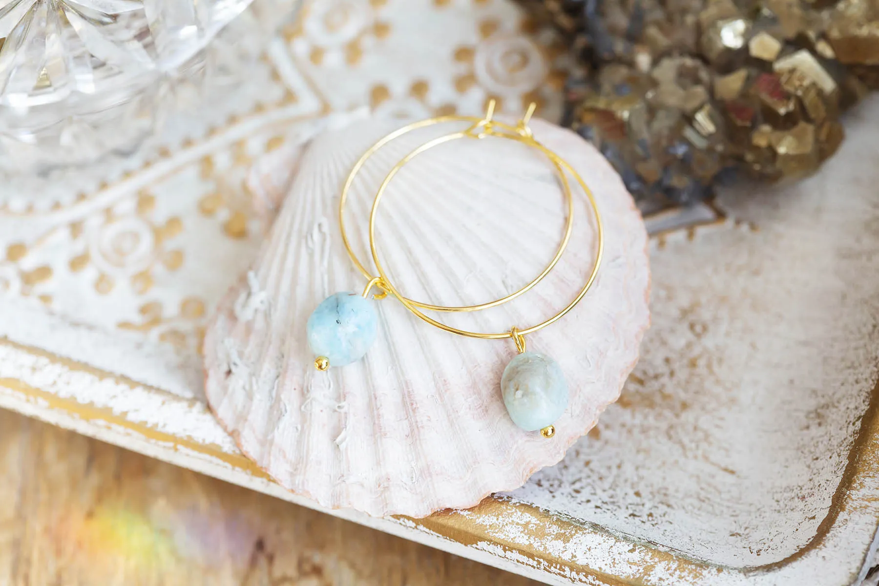 Překrásné minimalistické náušnice z mosazného kroužku pozlaceného 18k zlatem a s larimarem.