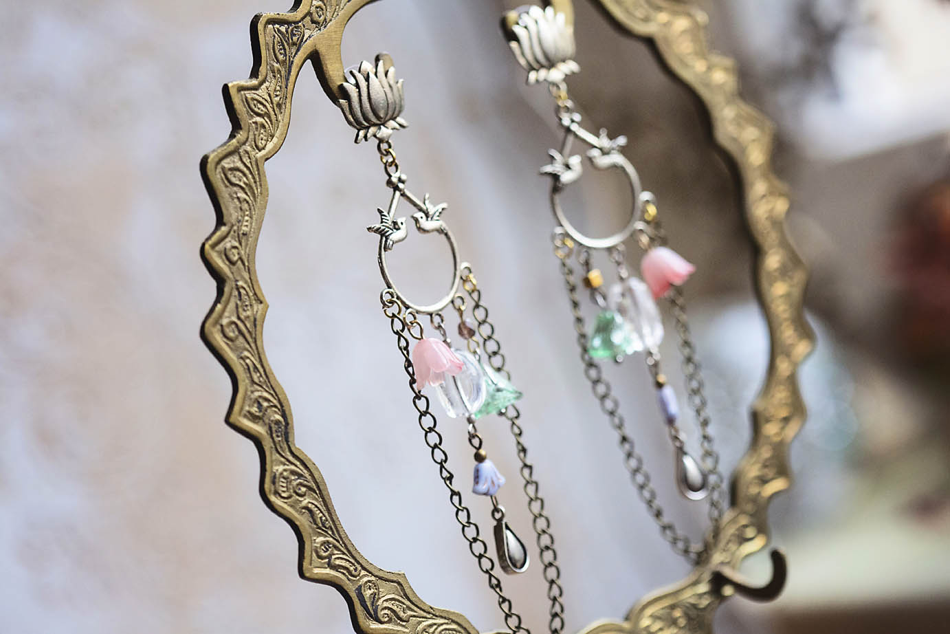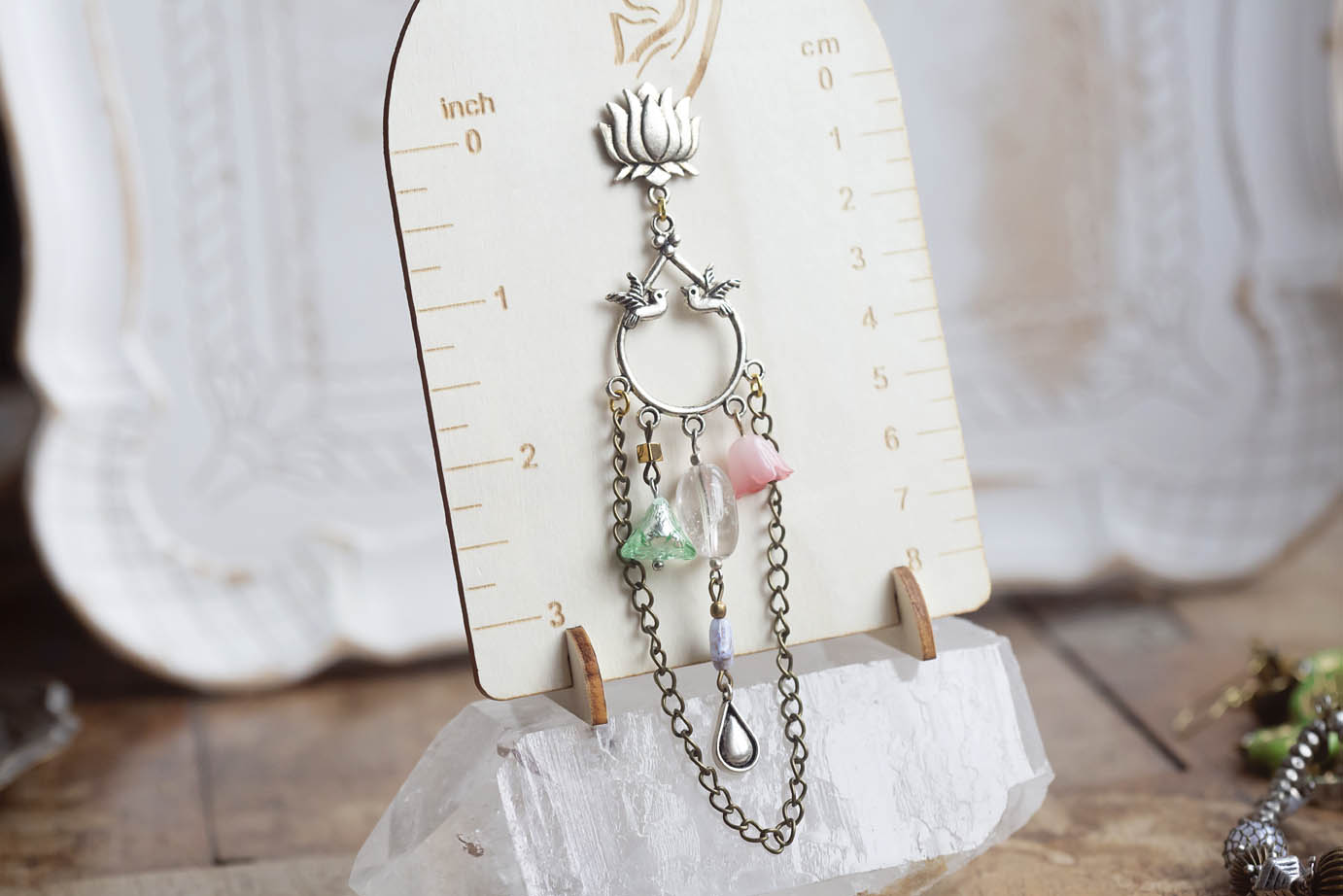 Tyto náušnice mají moje oblíbená slitinová ramínka, která jsem si nazvala Zamilovaní kolibříci. Z nich ústí krásné mosazné postříbřené puzety ve tvaru lotosů. Dole ve větru a pohybu tančí zvonky od českých sklářů i obyčejnějšího původu, masivnější kousek křišťálu a to celé orámoval mosazný řetízek který přišel bůhvíodkud.