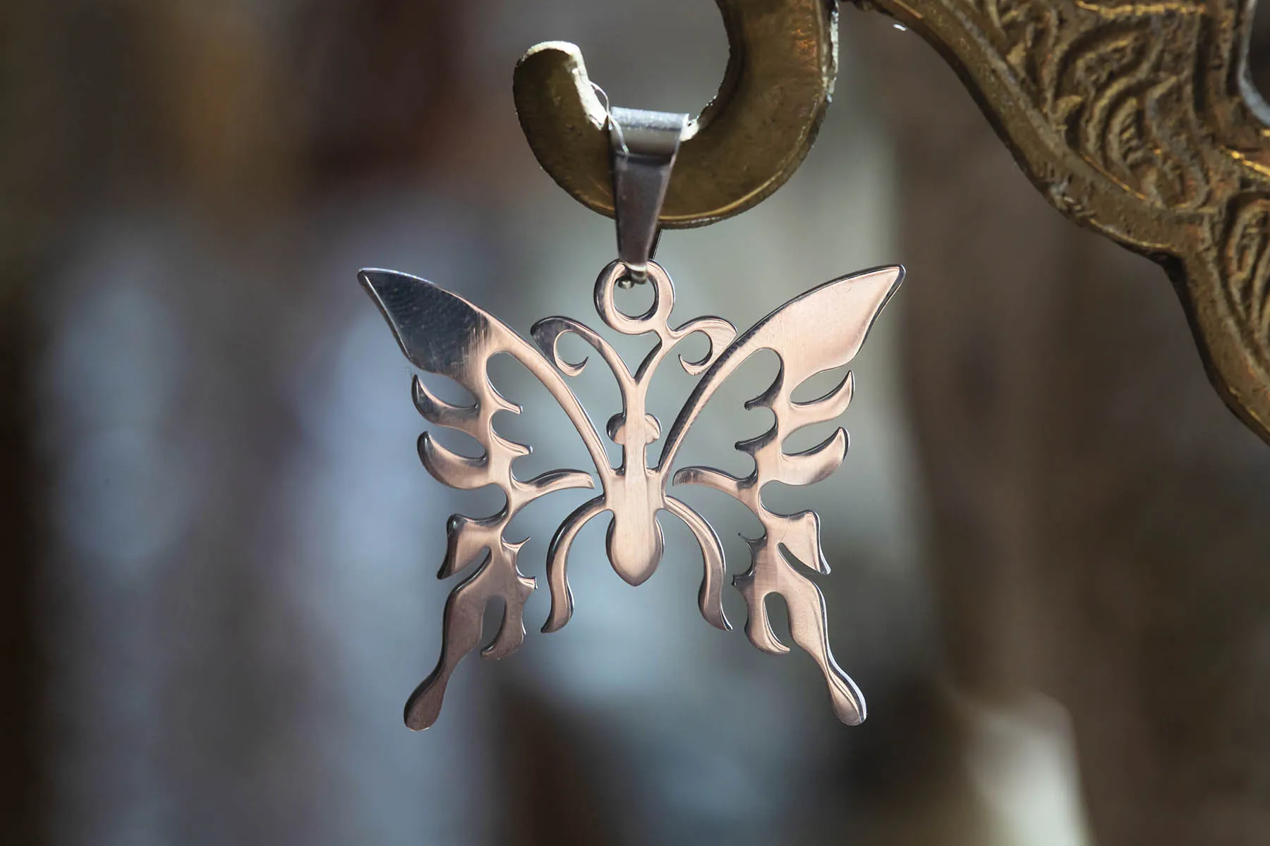 Překrásný jemně vyřezávaný přívěsek motýl z hypoalergenní nerez oceli, je výraznou ozdobou každého dekoltu.