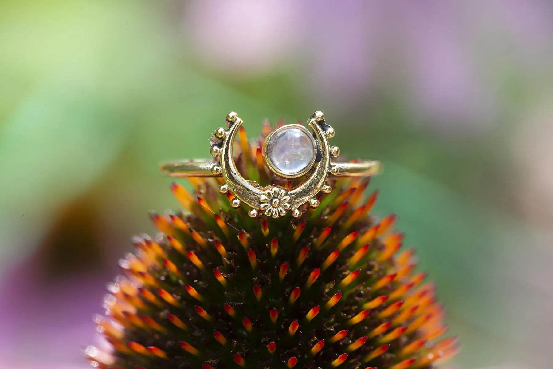 Intuice, tvořivost a šťastné vztahy - s tím vám může napomoci tento mosazný prsten luna s měsíčním kamenem. Jestli vás oslovil, kupte si ho hned, protože máme jen jeden!
