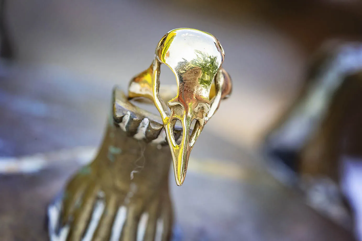 Nevšední výrazný mosazný prsten ve tvaru ptačí lebky pro čaroděje a čarodějky.