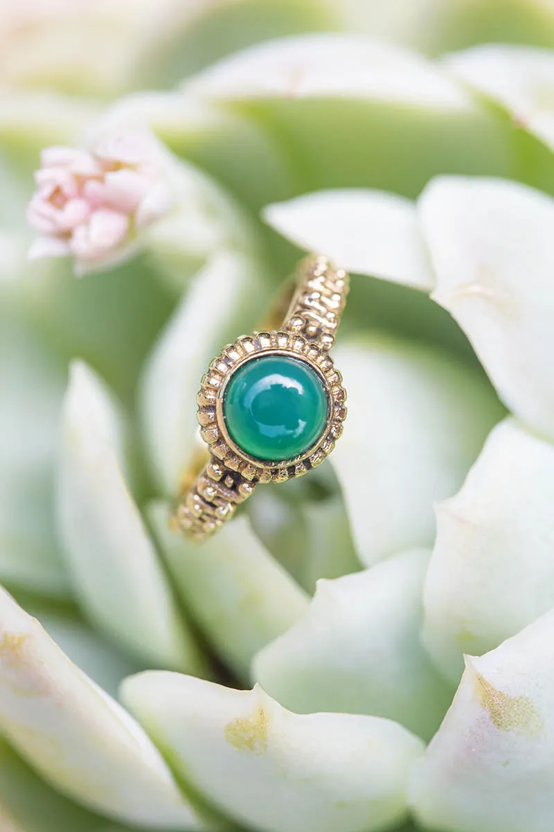 Jemný krásný mosazný prsten s kulatým drahokamem. Na výběr je zelený onyx, zelenomodrý tyrkys, bílý měsíční kámen, průsvitný růženín, černý onyx, zelenošedý labradorit, fialový ametyst a průsvitný zelený aventurin.