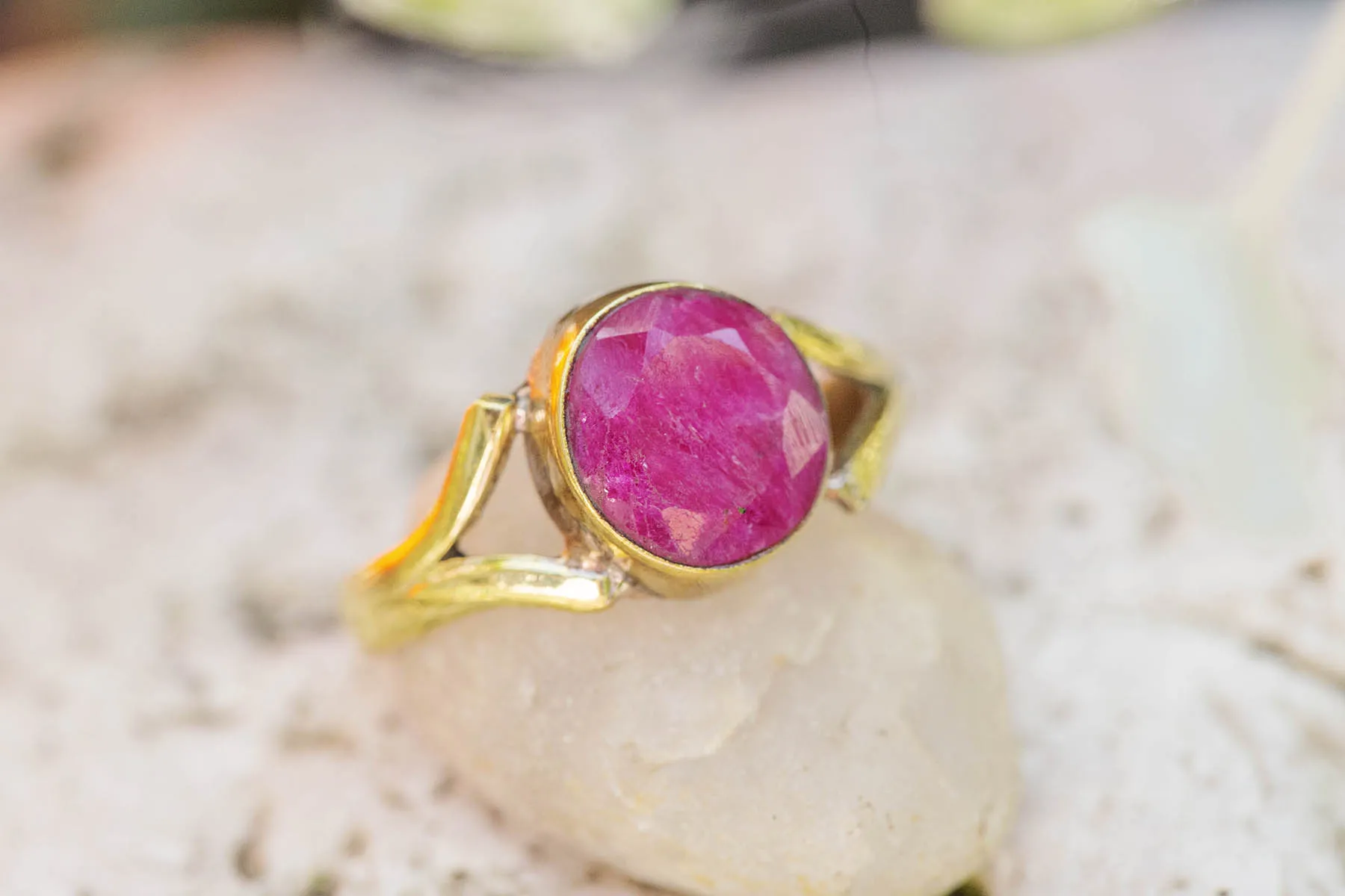 Překrásný mosazný prsten s kulatým fasetovaným indickým rubínem.